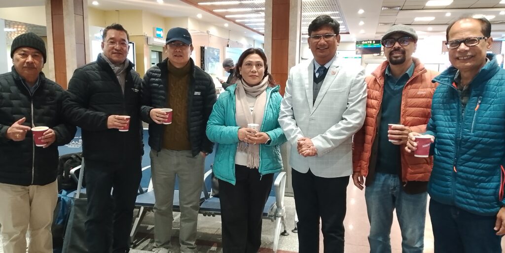 बिहान सवा सात बजेदेखि त्रिभुवन विमानस्थलमा रोटेरियन साथीहरू जम्मा हुन थालेका थिए। दिनेश मानन्धरको पहिलो उडान भएकाले उनी अलि चाँडै नै एयरपोर्ट पुगिसकेका रहेछन्। गुप्तबहादुर राना सँगै कुर्सीमा बसिरहेको देखें। केही छिनमै विद्वता प्रधान श्रेष्ठ हतारहतार गर्दै आइपुग्नुभयो। उहाँले हिजो साँझ मैले दिएको डायलग सबैलाई मजाक गर्दै सुनाउनुभयो, “म अलि ढिलो आउँछु है भाइ भनेको त यो मान्छेले! मैले कुर्ने होइन क्या रे, प्लेनले कुर्ने हो क्या रे भनेर मलाई डायलग दियो!” सबैजना खित्का छोडेर हाँस्दै थिए।