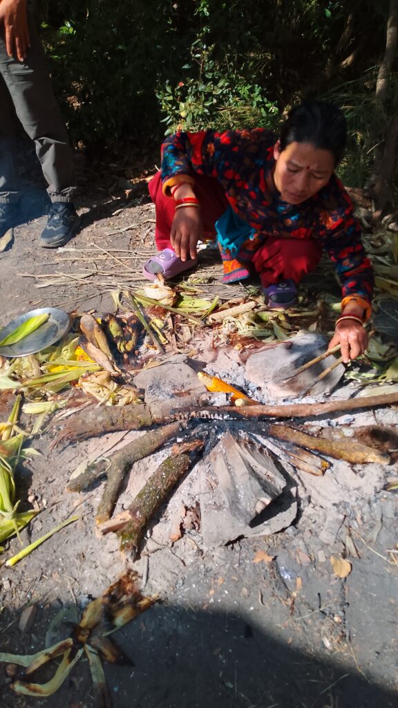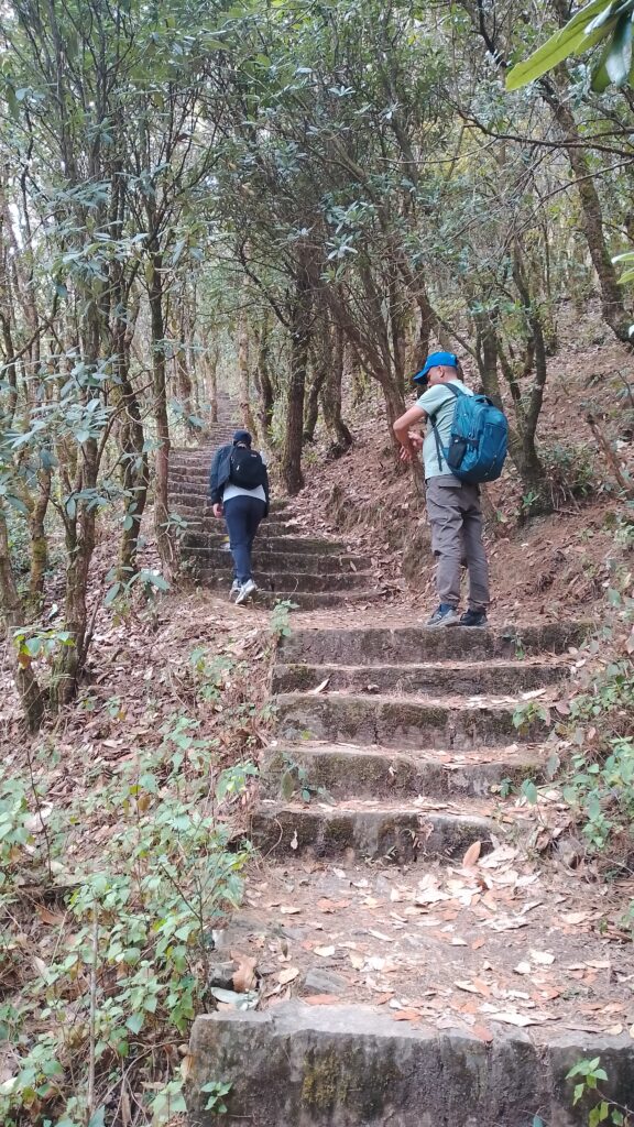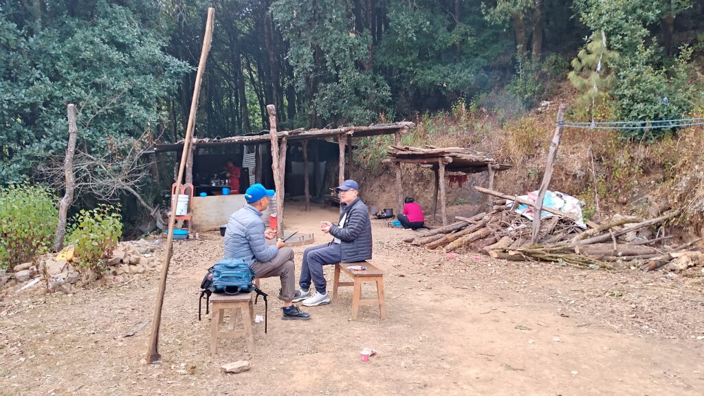We took the route to Bhasmasur Danda, down a bit, and then up, up, up to almost 2500m, the highest point. Very few hikers on this trail. After a long climb we reached Makwanpur district. We stopped at a local shop for milk tea… but wow, the price was almost like Himalayan Java coffee. Super expensive! Other tea houses were fair, but this one was fancy-price.