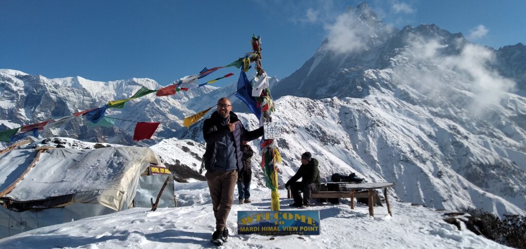 In the icy hush of 4:30 AM, we left High Camp behind, our breath fogging the air as we carved a path through virgin snow toward Mardi Himal’s View Point. Under-equipped but overdetermined, we pushed forward every step a battle against the cold, every gust of wind a test of willpower.