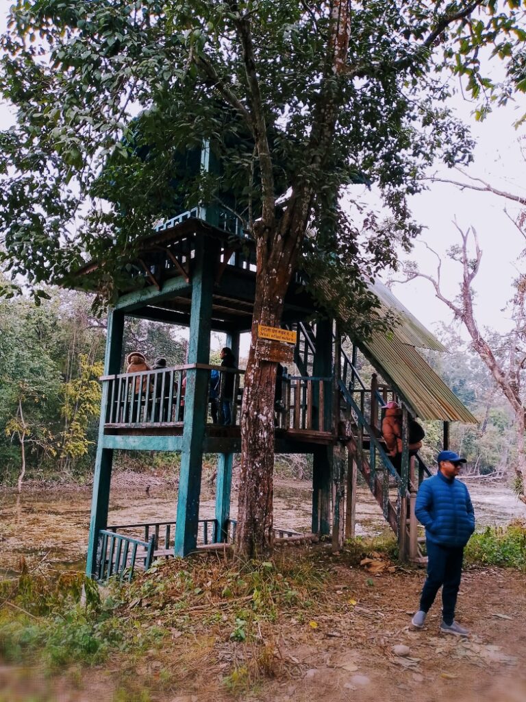 हामीलाई जंगलको घना हरियालीले स्वागत गर्यो, पातहरूको खसखस र चराहरूको मधुर चिरबिरले माहोल रमाइलो बनायो। टाढा कतै पण्डित हरिप्रसाद चौरसियाले बाँसुरी बजाएजस्तो लाग्थ्यो। कोही दूरबिनले जंगल नियाल्दै थिए, कोही मोबाइलको क्यामेरा लिएर तस्बिर खिच्न आतुर।