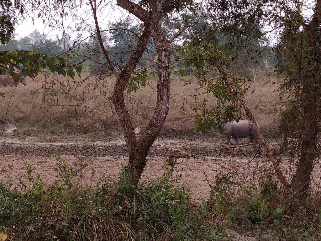 गाइड निराश देखिन्थे, तर अचानक प्रार्थनाले चिच्याइन्, “उ, गैंडा! त्यहाँ टाढा!” हामीले उनले औंल्याएको ठाउँमा आँखा दौडायौं। कोही उत्साहित भए, कोहीले देखेको नाटक गरे।